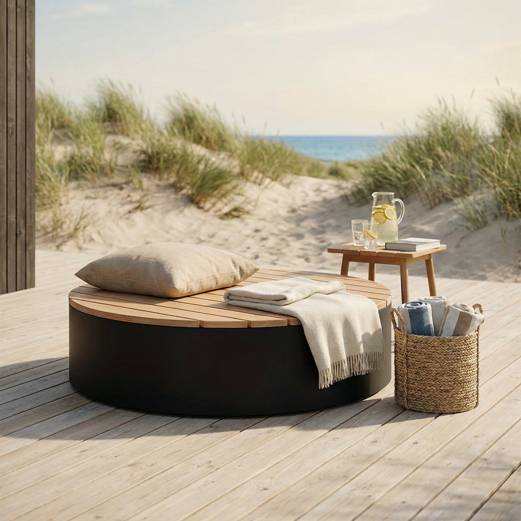 Stellet er udført i 3 mm stål og pulverlakeret i RAL7021 (mat, sortgrå), som giver et tidløst og roligt udtryk. Sædet er beklædt med massiv Cumaru hårdttræ, som er monteret skjult for et rent og gennemført design. Træet levers ubehandlet og vil med tiden patinere smukt til en sølvgrå nuance. Ønskes den gyldne farve bevaret, kan træet med fordel behandles med olie.
