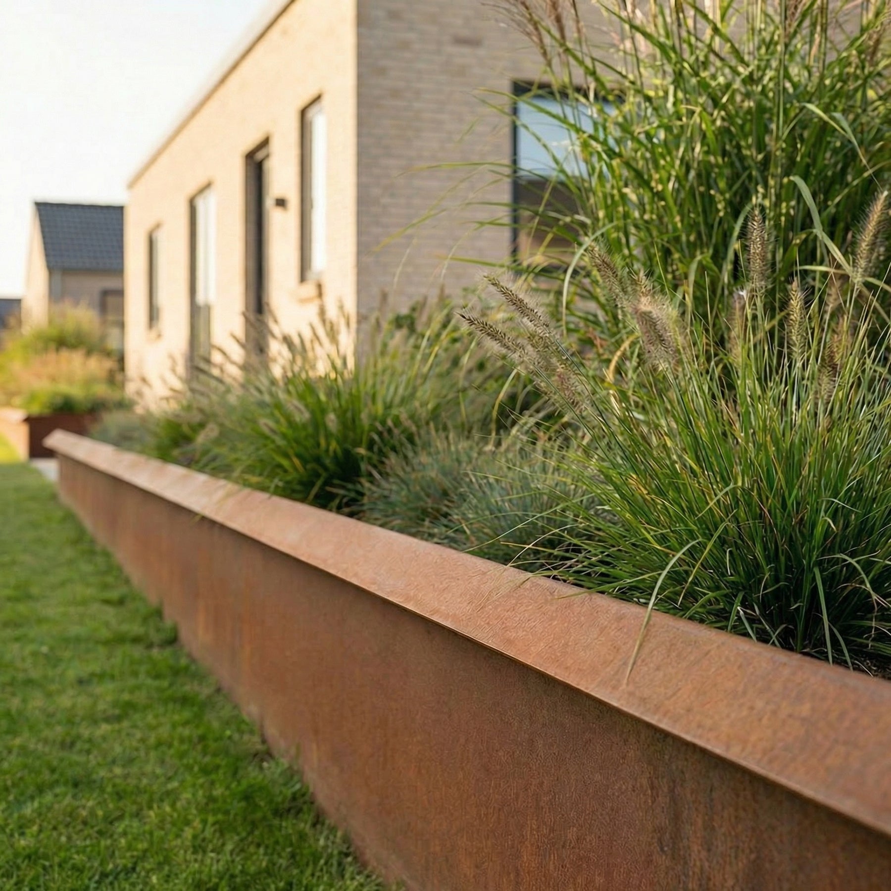 Bedafgrænsning med sneglekant kan ikke bues og egner sig kun til lige linjer. For mere organiske former anbefales vores bedafgrænsninger i 2 mm cortenstål.