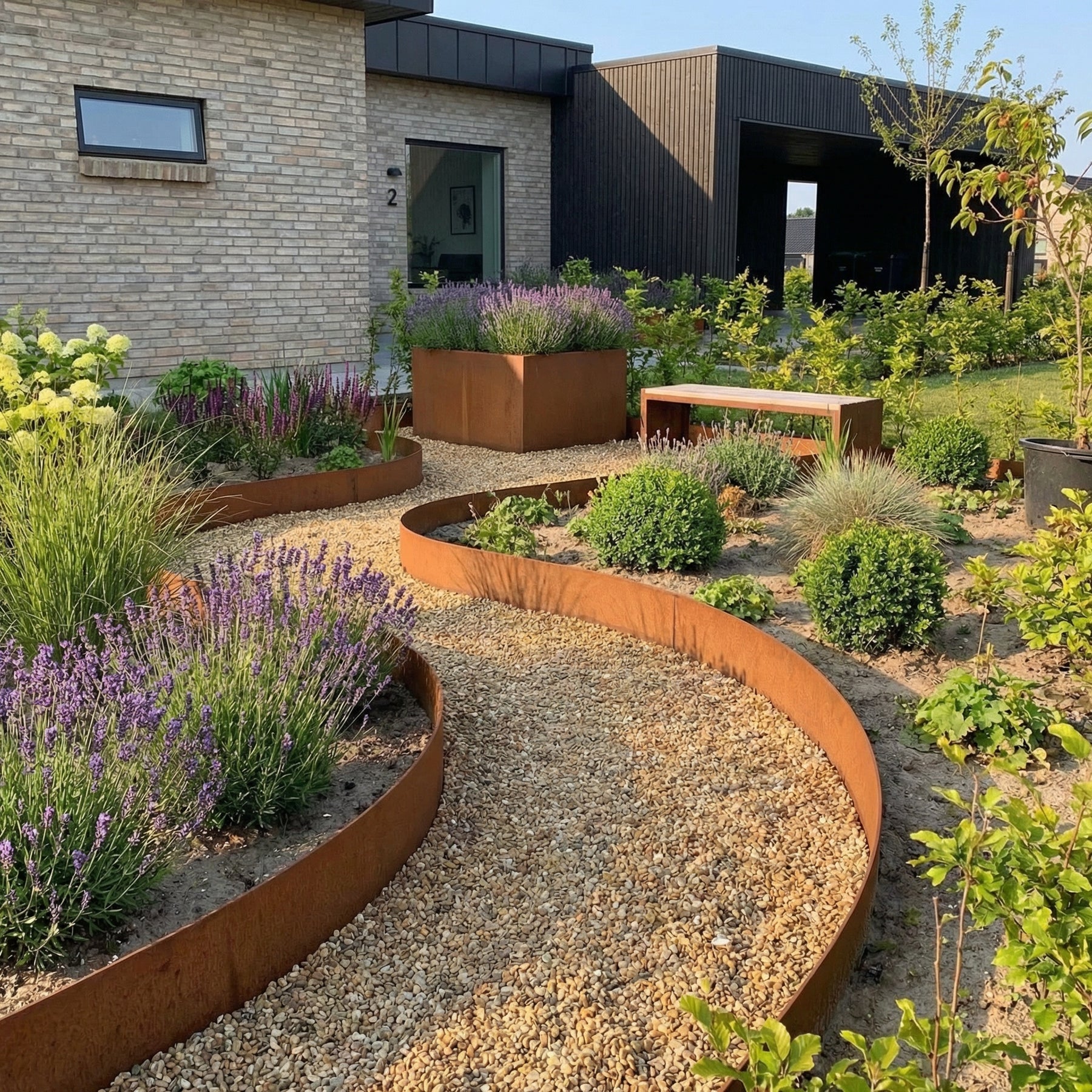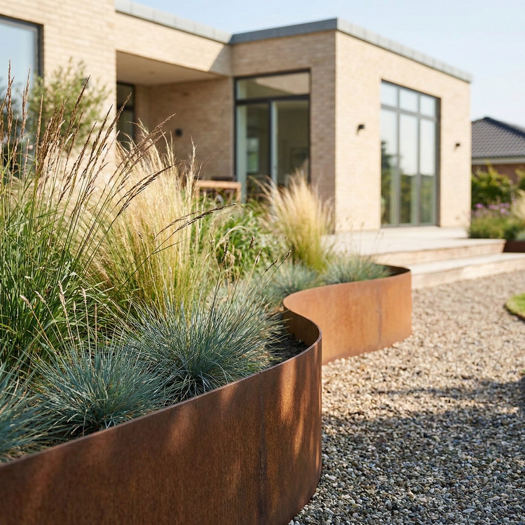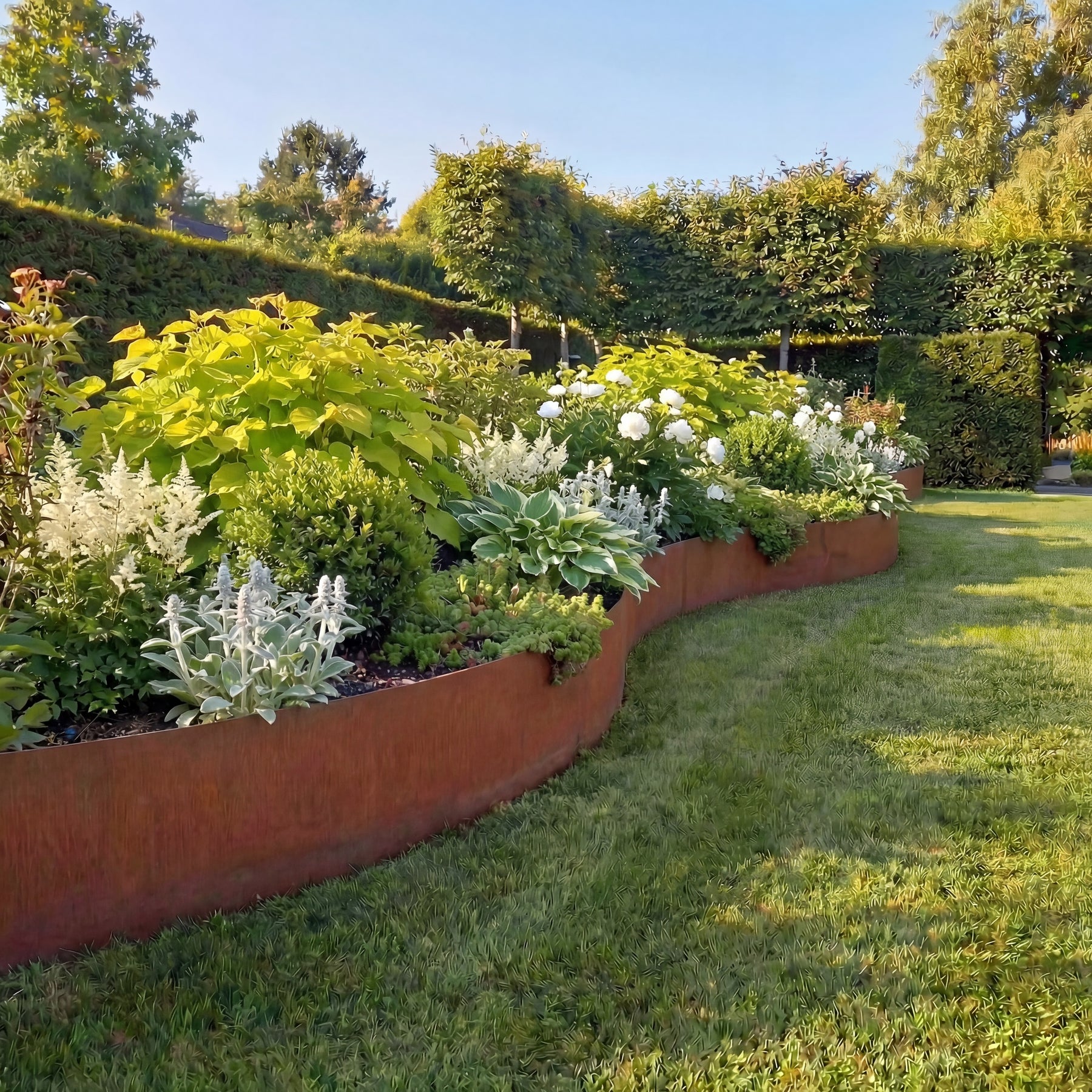 2 mm cortenstål er ideelt, hvis du ønsker organiske, buede former i din have. Det er let at arbejde med, men stadig stabilt nok til at skabe smukke rette linjer. Til meget lang og lige stræk anbefaler vi dog vores bedafgrænsninger i 3 mm cortenstål.