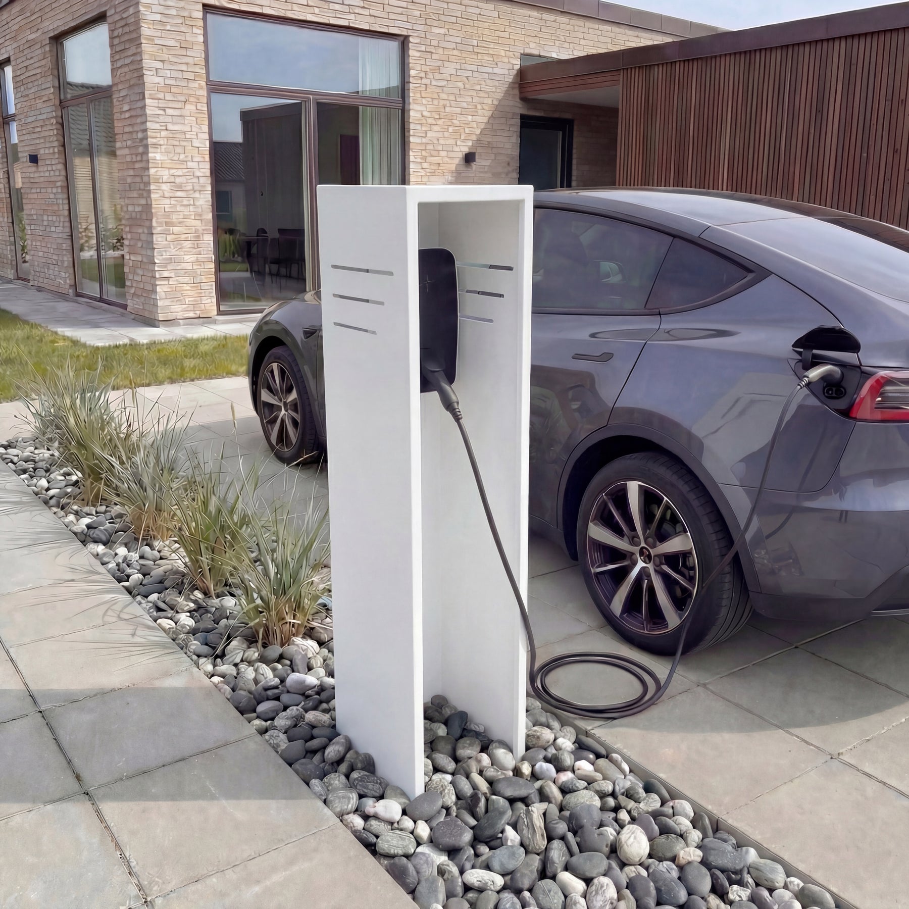 Gør din ladeløsning lys og indbydende med vores fritstående ladeboksstander i hvid pulverlakering.