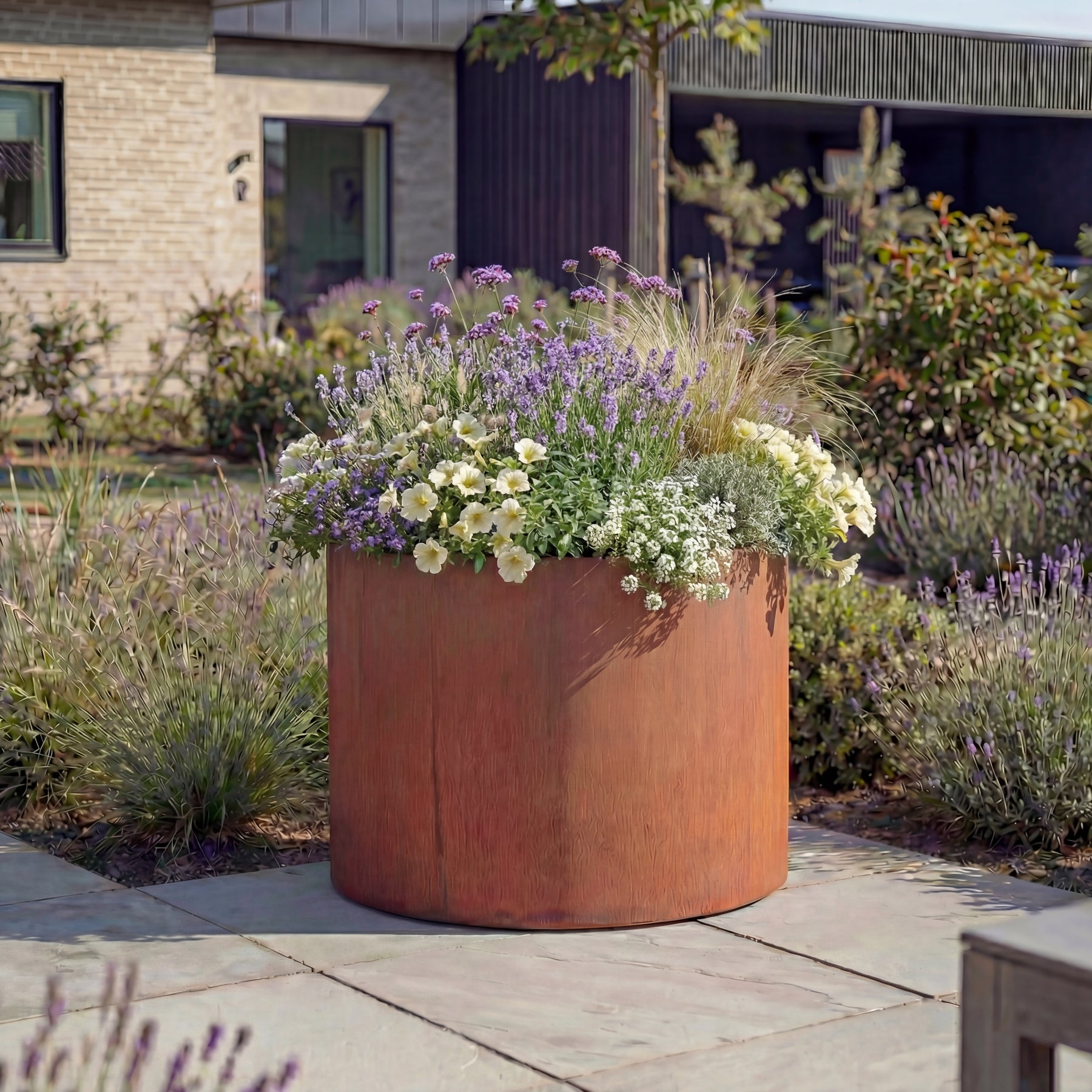Vores runde plantekasse i 3 mm cortenstål bliver håndlavet på vores fabrik i Løgstør - helt efter de mål, der passer til dit uderum. Med vores prisberegner kan du nemt indtaste diameter og højde i centimeter og få prisen med det samme. Når plantekassen er lagt i kurven, vælger du blot det ønskede antal.