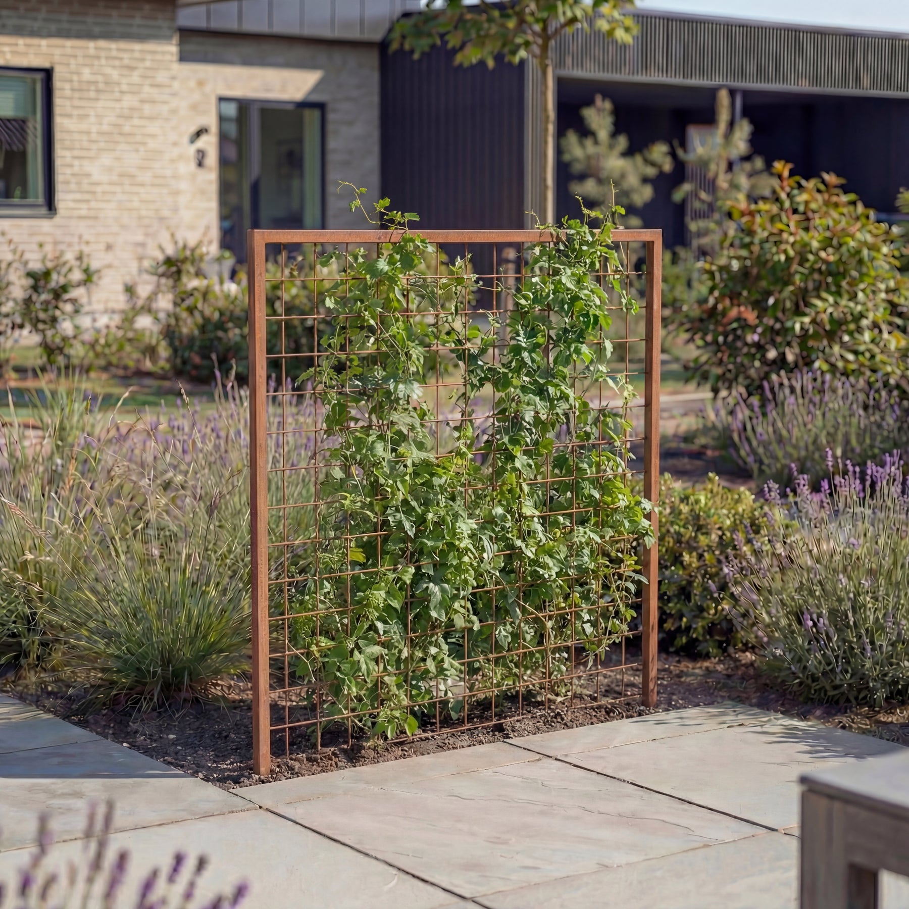 Dette espalier i cortenstål er perfekt til slyngplanter og andre planter i haven. Det kan også bruges til at skabe rum eller opdele haven på en stilfuld måde. Espalieret er fuldsvejset og leveres komplet samlet fra vores eget værksted, så det er klar til brug ved levering.